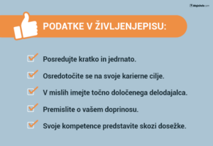 Pisanje življenjepisa je lahko naporno, če niste prepričani, kako začeti. Predlagamo vam, da najprej določite svoje karierne cilje, želena področja dela in vrste delodajalcev, na katere se želite osredotočiti pri iskanju zaposlitve. V nadaljevanju vam svetujemo, kako izbrati ustrezno obliko življenjepisa, in pomagamo s primeri in predlogami, ki si jih lahko prenesete in si tako olajšate pripravo svoje najboljše prijave na delovno mesto. Več o tem, kateri so obvezni elementi dobrega življenjepisa in kako naj je videti spremno pismo, s katerim pospremite svoj življenjepis, preberite v članku Kako do uspešne in učinkovite prijave na delovno mesto.